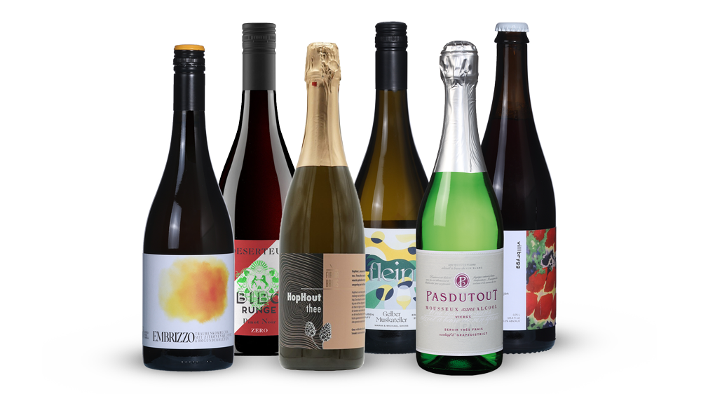 In this tasting box, you'll discover how versatile non-alcoholic drinks can be. We start with the refreshing bubbles of Pas du Tout, perfect for raising a glass. Next, we move on to the elegant Hophout Sparkling Tea from Betuws Wijndomein, where floral herbs, subtle wood, and gentle acidity come together. Then, taste the aromatic grape juice from Gross Flein, made from Gelber Muskateller, full of floral and fruity notes. With the Embrizzo Bianco grape kombucha, you'll experience how exciting fermentation can be, with fresh acidity and lively tension. The Villbrygg Fjell 01 brings a completely different dimension with wild berries and herbs from the North. And we finish with the oak-aged, non-alcoholic Bibo Runge Deserteur Pinot Noir, full of elegant red fruit and a soft structure.