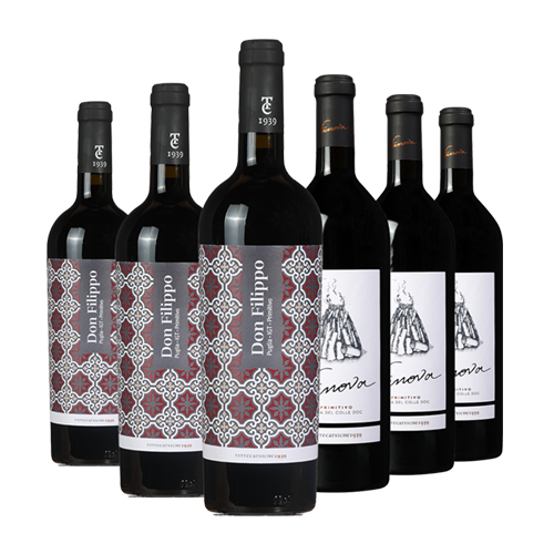 Wie ondergedompeld wil worden in het Italië van weleer, moet niet in het door toeristen uitpuilende Rome of Venetië zijn, maar in Puglia. Het is hier warm, heel warm! De Sirocco (de befaamde wind uit het zuiden) zorgt voor nachtelijke temperatuurdalingen, waardoor de druiven kunnen bijkomen van de hoge temperaturen overdag en de druiven hun frisheid behouden. Je vindt in deze box de twee primitivo's van het wijnhuis Terrecarsiche. De Don Filipppo Primitivo barst van het verleidelijke donkere fruit zoals kersen en bramen. Ook de Fanova Primitivo heeft veel donkerrood fruit, maar is nog kruidiger en krachtiger. Geniet van de primitivo druif met deze proefbox!
