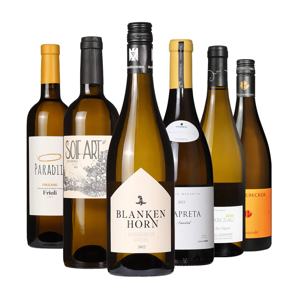 Een goede wijnproeverij heeft een opbouw van licht naar zwaar en dus beginnen we met een aantal frissere wijnen. We bijten het spits af met de weissburgunder van Max Pfannebecker. Deze Duitse wijn heeft verfijnd citrusfruit, zacht perenfruit en aroma's van gebrande noten. Daarna een Franse favoriet: sauvignon blanc uit de Loire. Fris, stuivend en vol citrus. We vervolgen onze proeverij voor wat meer fruitige wijnen. Deze trappen we af met de 'witte wijn van 2023', een Gutedel uit Baden, Duitsland. De volgende is een meer aromatische wijn uit Friuli, Italië. Deze Paradiis Friulano zit vol tropisch fruit en heeft een notige finish. We sluiten de box af met twee bijzondere rijke blends van lokale druivenrassen. De eerste komt uit de Portugese Alentejo, waar wijnmaker Antonio als enige nog met het bijna uitgestorven druivenras alicante branco werkt. De tweede wijn en tevens de afsluiter van onze proeverij is een kruidige blend van traditionele Zuid-Franse rassen, die gevaarlijk doordrinkbaar is.